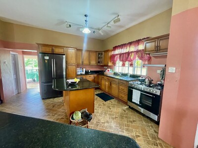 An unpaved driveway leads to a spacious garage to the left side of the house. There is plenty room for parking. Through the garage, you enter into a utility space with laundry facilities, storage and a pantry. This is adjacent to the kitchen. The kitchen is very impressive both in size and design. It features black, granite countertops and modern cabinetry. There is a lot of storage space. Built for a chef, the kitchen has plenty room for food preparation, including a large, centre island. There is a back door leading to the yard, which brings on breeze and natural light.