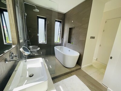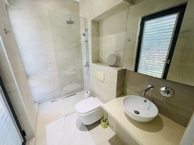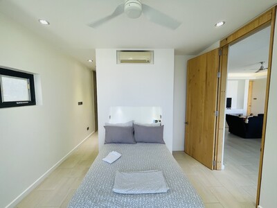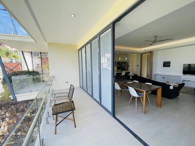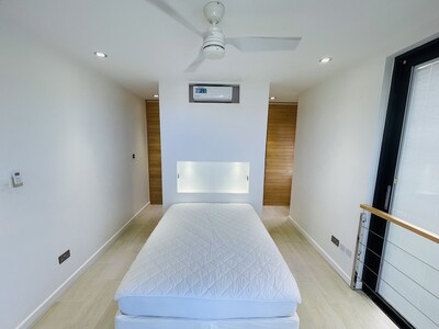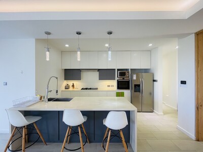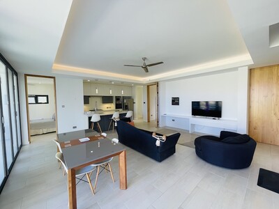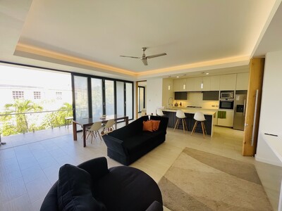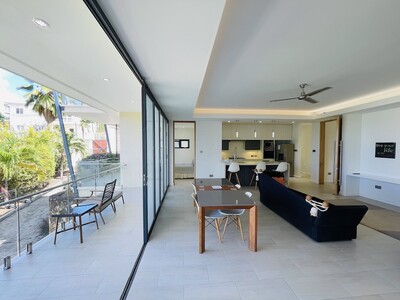 This is a 2 bedroom, 2 and a half bathroom luxury apartment for long term rent in Rodney Heights. Minimum lease term, 1 year. The apartment is fully furnished with modern amenities. It is within walking distance to Rodney Bay, so having a vehicle is optional, however, there is parking for 2 vehicles. There is street level access, with no stairs, which makes it appropriate for people with limited mobility. The floor plan is open through the kitchen, living and dining rooms. Floor to ceilig folding glass doors can be opened to give seamless access to the balcony. Each bedroom has balcony access, generous storge and a modern en-suite bathroom. The rent includes water, cable and internet. Features include: